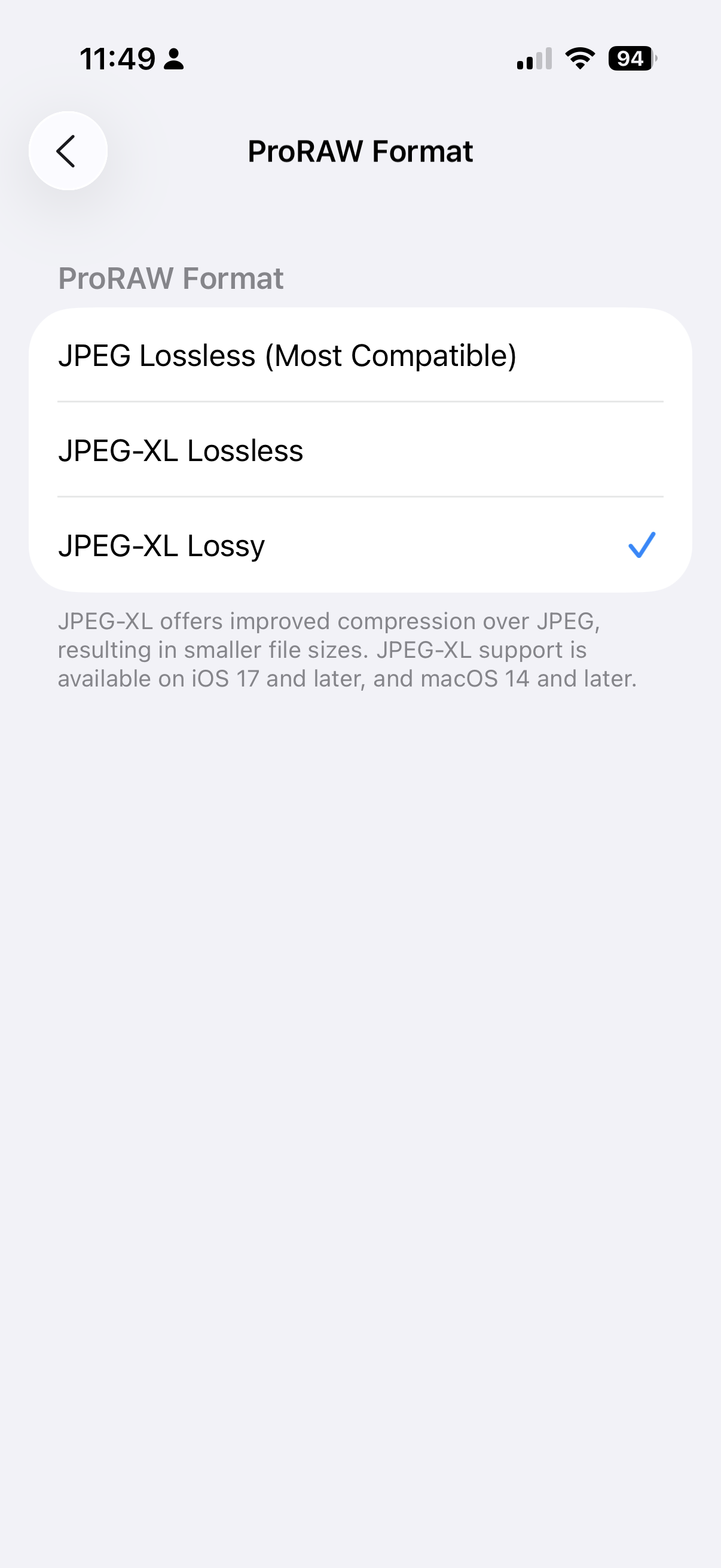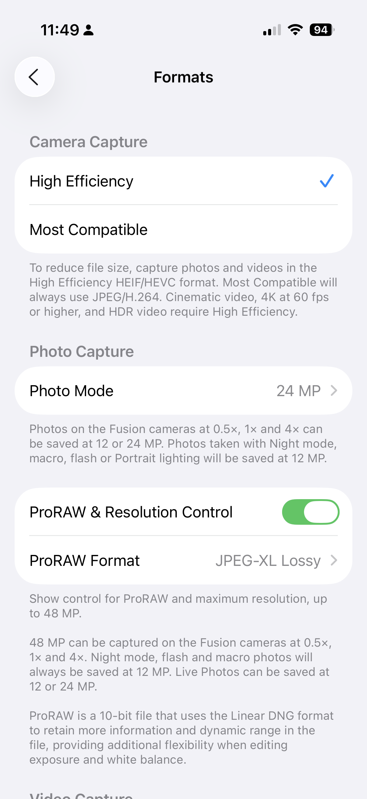 - Turn on: High Efficiency and ProRAW Resolution Control